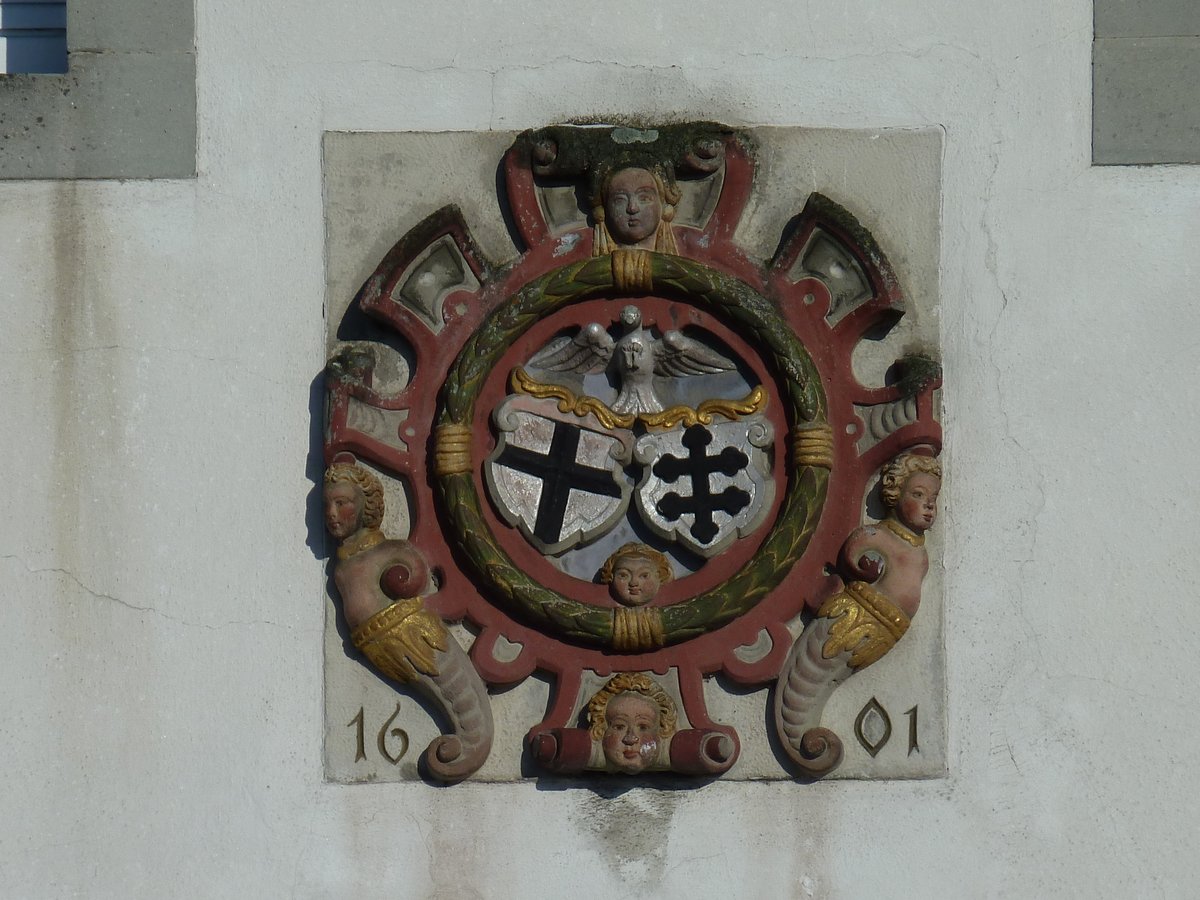 Zwischen dem I. und II. Stock ist an der Giebelfassung eine reiche ornamentierte Cartouche mit Engelköpfchen eingesetzt, die einen Lorbeerkranz trägt, in dem ein Doppelwappen (Schild mit einfachem Kreuz und Schild mit Kreuz von zwei Querbalken) mit darüber schwebender Taube ausgehauen ist. Über dem Eingangstor der Traufseite des Hauses befindet sich das gleiche Wappen aus Rorschacher Stein gemeißelt.“