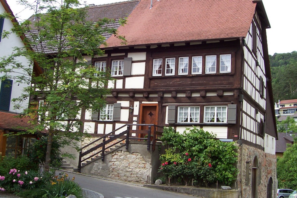 Das Fachwerkhaus stammt aus der Zeit um 1600. Beachten Sie wiederum die massive Holzbohlenwand mit Fenstererker im 1. Obergeschoss. Auch hier handelt es sich um ein gestelztes Weinbauernhaus mit einem großen gewölbten Keller im Sockelgeschoss, der als Weintorkel diente. Ebenso ein Bruderschaftshaus. Ees gehörte der Leprosenbruderschaft. hat heute 3 Eigentümer, besteht aus 2 Wohnungen mit Keller extra.